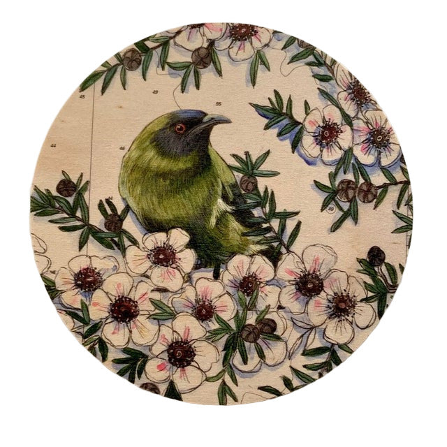 Art print on ply circle featuring the iconic native tui amongst mānuka flowers.