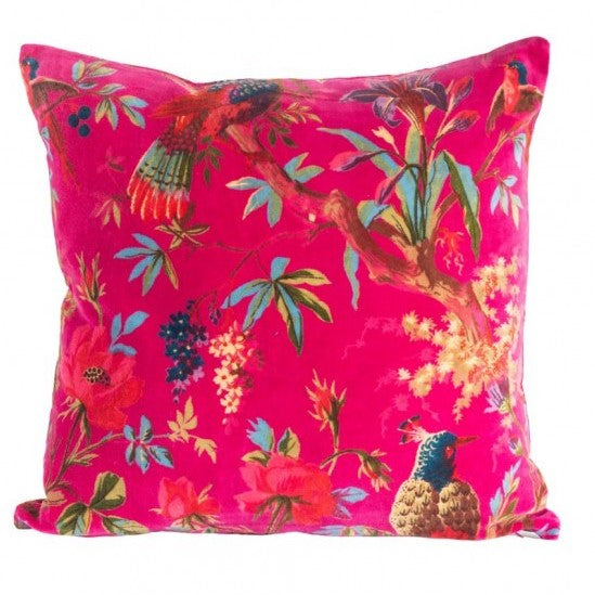 Add some style and luxury to your home with a Bird of Paradise Velvet Cushion in Hot Pink. This luxurious cotton velvet cushion cover with its vibrant vintage bird design will complement any decor. The cushion cover is patterned on both sides.