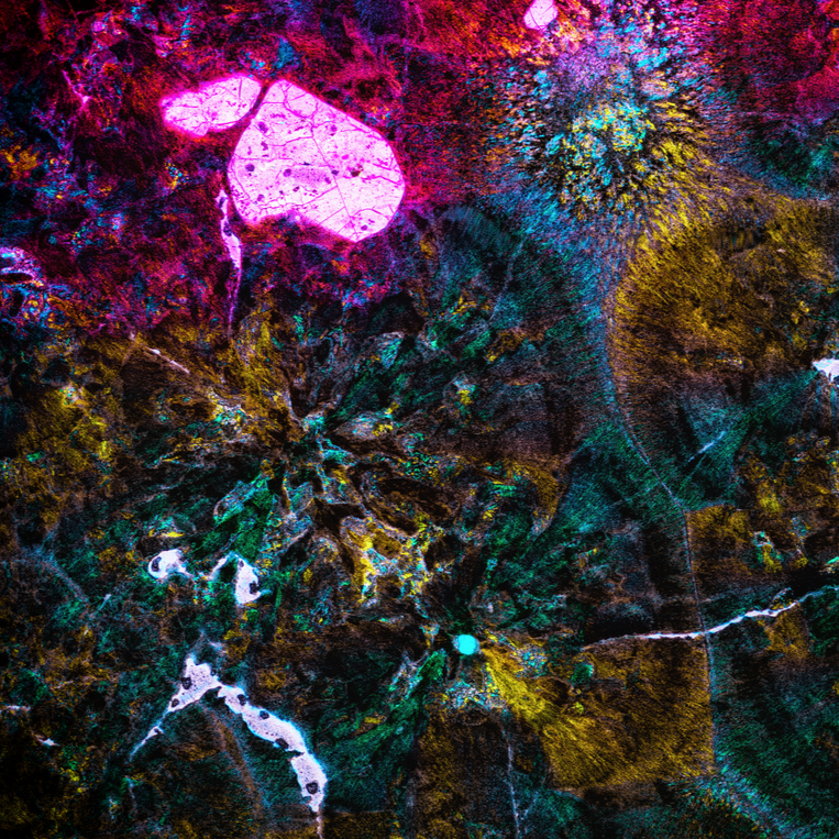 Kamen Engel is a Christchurch-based geologist and photographer. He captures these beautiful images by photographing paper-thin slices of rock through a microscope, revealing a hidden world of minerals. The final product is actually composed of many (often hundreds) of smaller images seamlessly stitched together to produce a kaleidoscopic glimpse into what our eyes can't normally see.