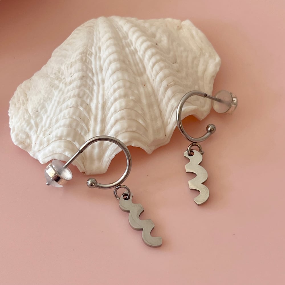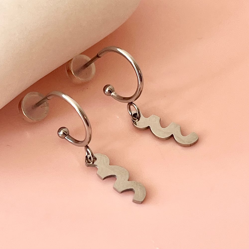 Stainless Steel half hoops with a stainless steel wiggle charm. Size of hoops 11.5mm and charm 15x4mm. Comes in a cute gift bag.