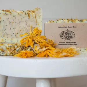 Ingredients: olive, coconut & avocado oil; water; soda lye; dried calendula; poppy seeds; essential oil of litsea cubeba