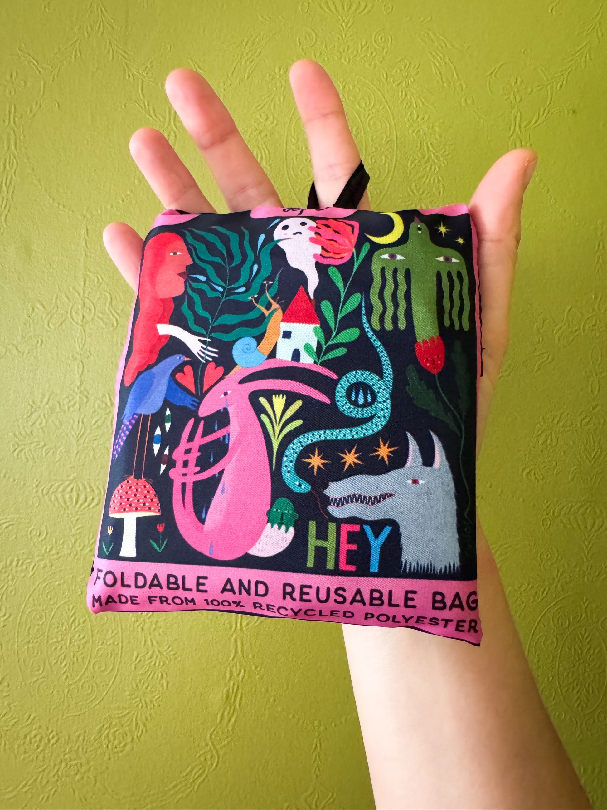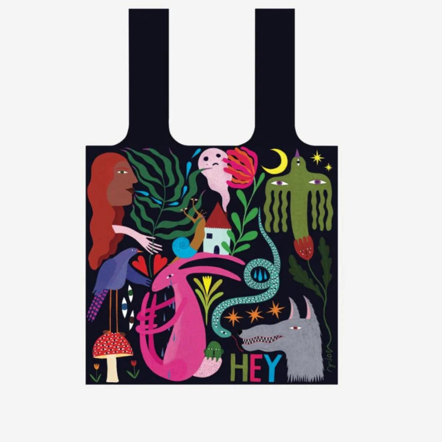 Eco-friendly, reusable foldable bag, crafted from recycled plastic bottles. This stylish and sustainable accessory features unique art on the front, blending function with creativity. Perfect for shopping, carrying essentials, or as a handy extra bag on the go, it folds neatly for easy storage and helps reduce waste while showcasing your commitment to a greener planet.